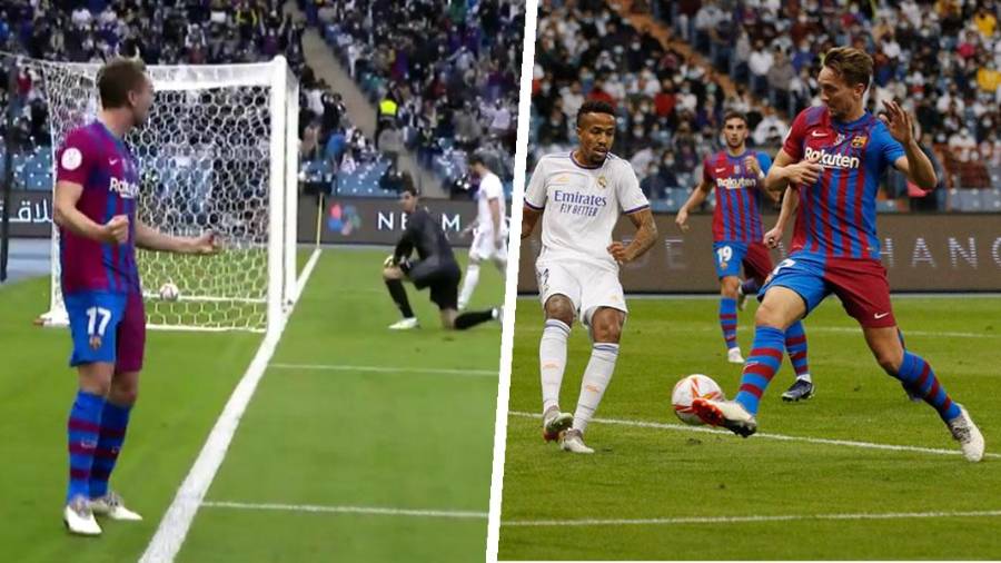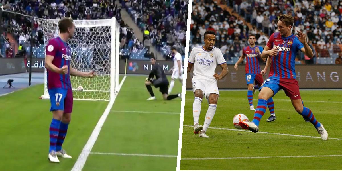 Un centro raso de Ousmane Dembélé al primer palo, llega Éder Militao antes que De Jong, pero el despeje del central brasileño toca en la espinilla del delantero holandés, la pelota va al palo, despista a Thibaut Courtois y acaba entrando en la portería madridista, en el minuto 41.