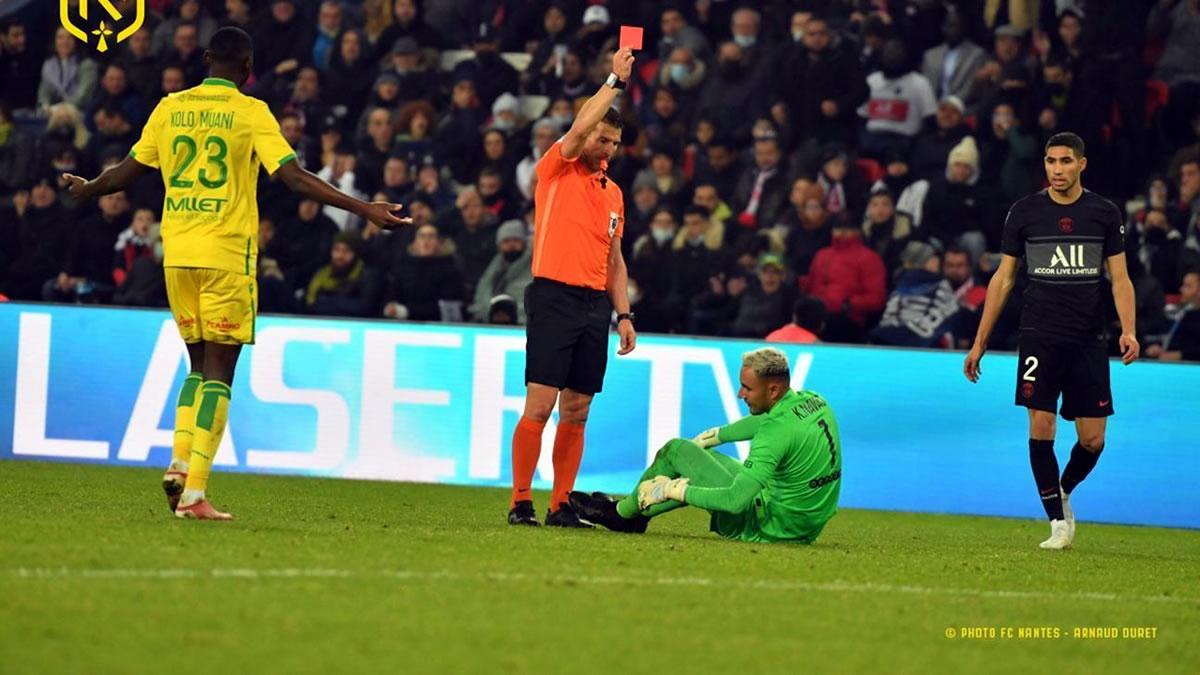 Keylor Navas fue expulsado este sábado en el encuentro entre el París Saint Germain y el Nantes correspondiente a la jornada 14 de la Ligue 1 de Francia, que terminó ganando el equipo parisino pese al error del portero costarricense.