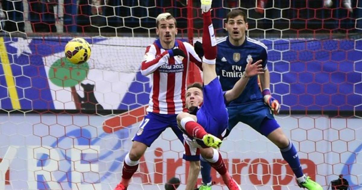 Saúl Ñíguez marcado un golazo de gran factura en el derbi madrileño que le está ganando el Atlético de Madrid 2-0 sobre el Real Madrid en el estadio Vicente Calderón.