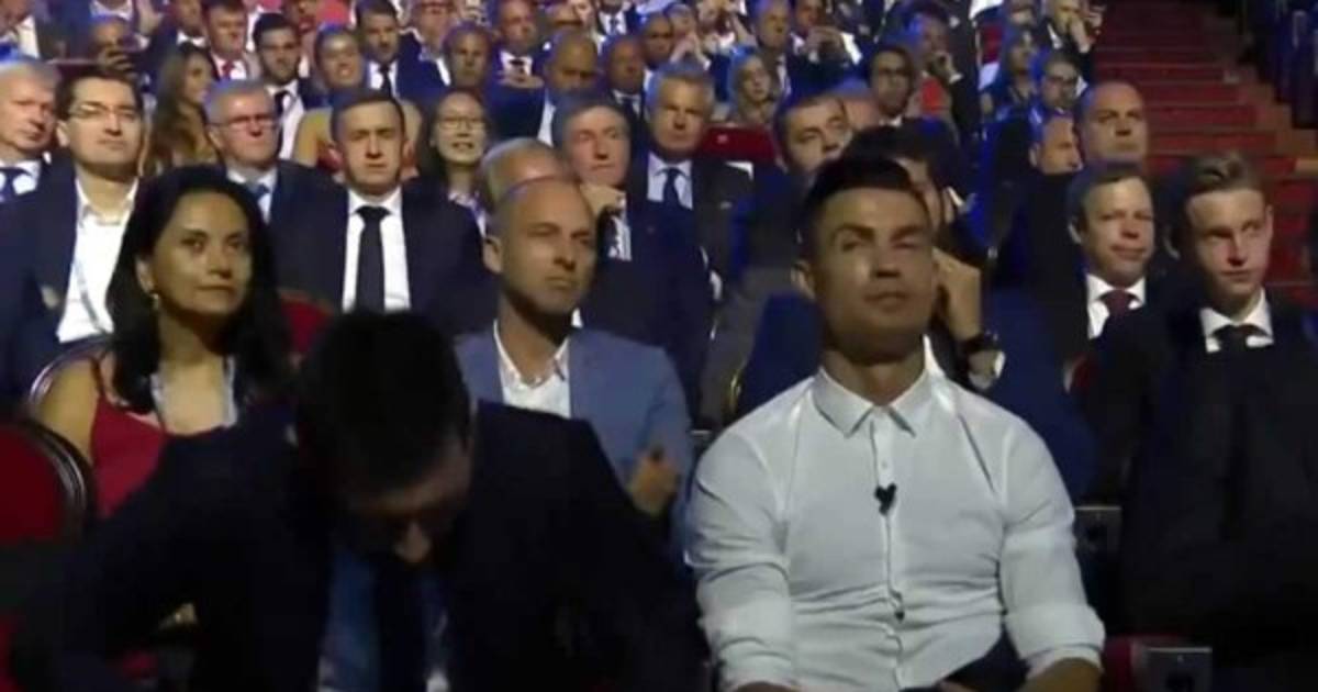 La cara que hizo Cristiano Ronaldo cuando Messi fue anunciado como Mejor Delantero de la temporada pasada.