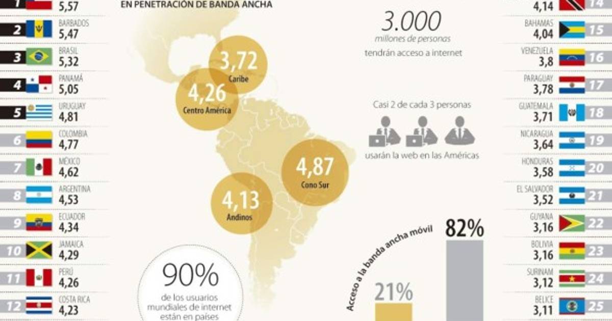 Los 26 países de la región incluidos en el índice alcanzan una nota de 4.37 en el Índice de Desarrollo de Banda Ancha (IDBA). En contraste, los países integrantes de la OCDE tienen un IDBA de 6.14. Chile logra una nota combinada de 5.57 en el IDBA, seguido por Barbados con 5.47 y Brasil con 5.32.