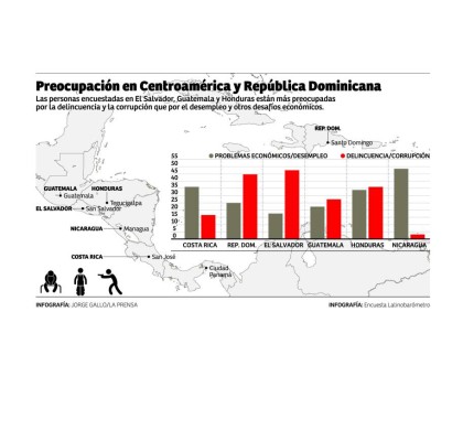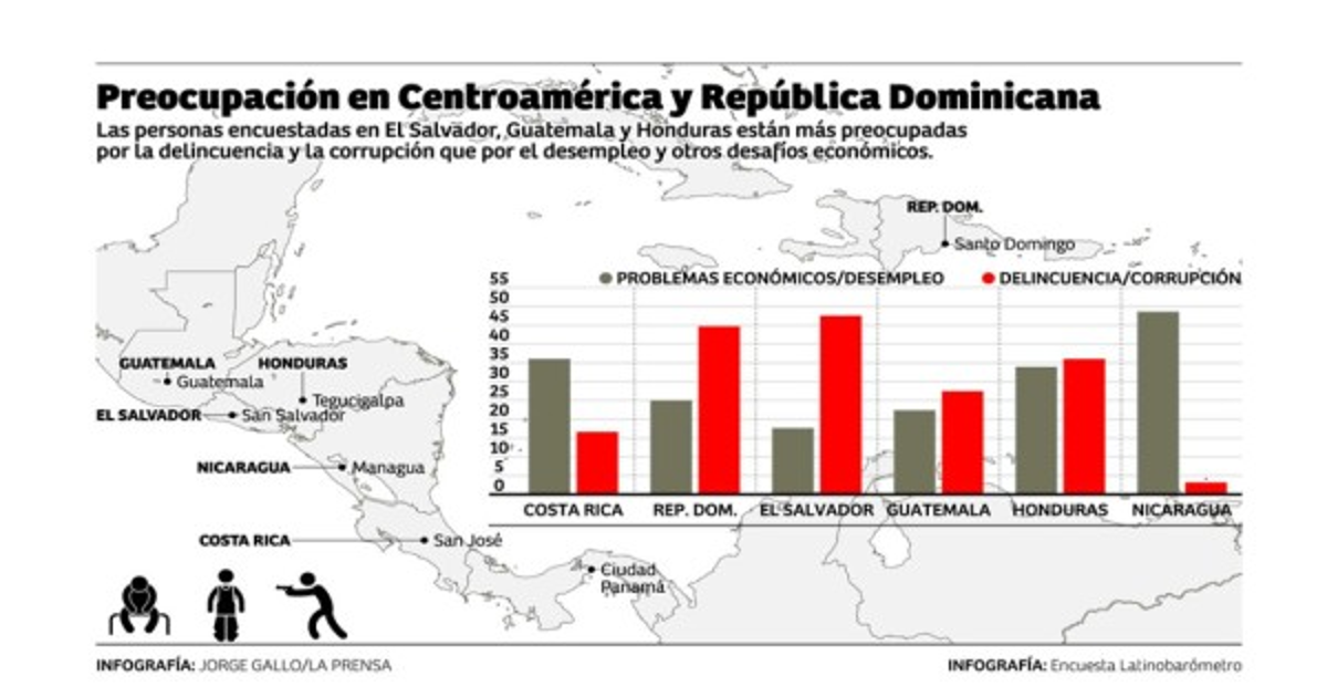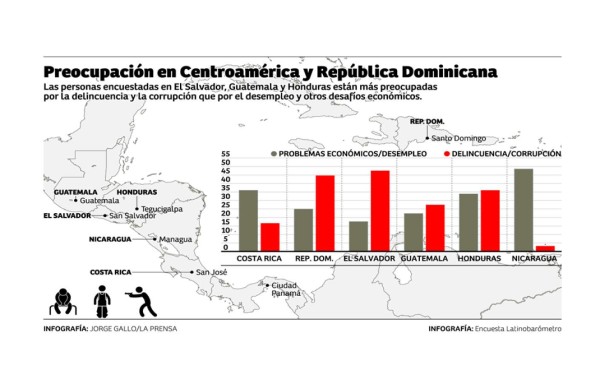 La encuesta de Latinobarómetro muestra que la delincuencia y la corrupción superan al empleo y otros desafíos económicos como los más apremiantes en el Triángulo Norte.
