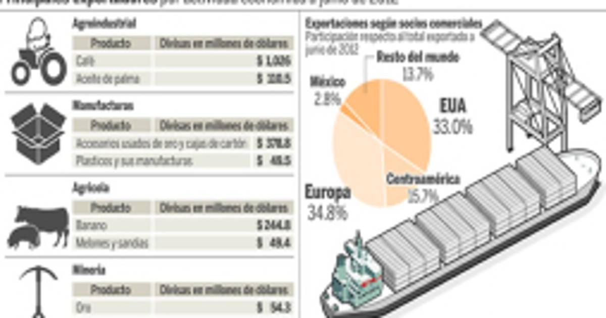 Separados por actividades económicas -agroindustriales, manufactura, agrícola y minería- es el agro el que mayor soporte da a la economía. Al ver los principales productos de exportación, por ingresos generados, en esta separación destacan el café, las manufacturas de plásticos, el banano y el oro, sobrepasando los 1,700 millones de dólares en los primeros seis meses de este año. Mientras, el aceite de palma africana, plásticos, melones y sandía y la plata ocupan las segundas posiciones.