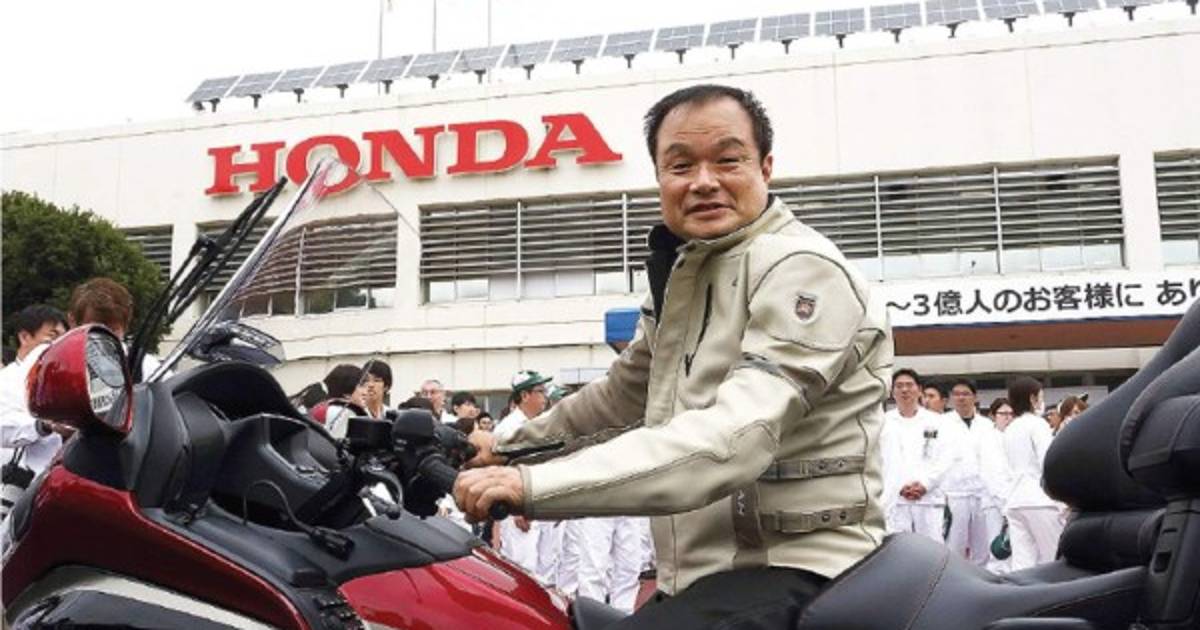 El presidente ejecutivo de Honda Motor Co., Takanobu Ito , vestido con una chaqueta de cuero al estilo motociclista y un casco rojo, condujo hasta la planta de la compañía en Kumamoto, sur de Japón, en una motocicleta roja Gold Wing la semana pasada para celebrar la producción de la moto número 300 millones de la compañía.