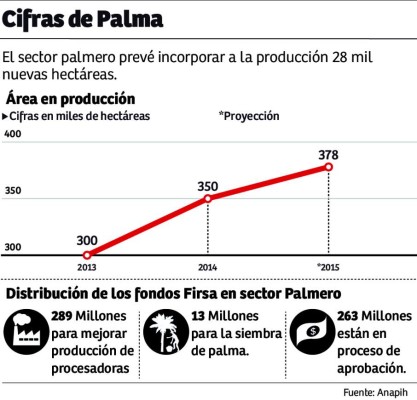 En el país hay un área sembrada de 350 mil hectáreas que generan 1.4 millones de toneladas de aceite; pero con el programa de reactivación se espera que entren en producción 28 mil nuevas hectáreas en 2015, un crecimiento del 8%, informó Antonio Mejía, presidente de la Asociación Nacional de Campesinos Hondureños (Anach).