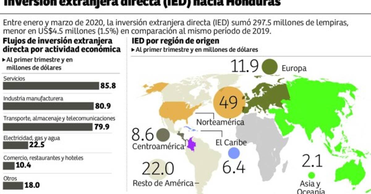 En Honduras, de acuerdo con el informe de IED a marzo de 2020 que elaboró el Banco Central (BCH), preliminarmente se ha estimado un flujo de inversión extranjera directa hacia Honduras de $297.5 millones (L7,437.5 millones), menor en $4.5 millones (L112.5 millones) en comparación con el mismo período de 2019; es decir, una caída de 1.5%.