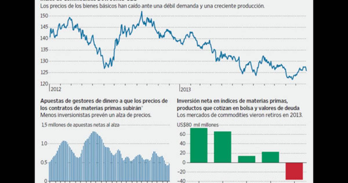El Índice de Commodities Dow Jones-UBS, que sigue 22 bienes básicos que cotizan en Estados Unidos y Londres, cayó 9,6% en 2013, su tercera pérdida anual consecutiva. Ante un alza de 30% del índice bursátil S&P 500 en el año que culminó, la brecha entre las acciones y los commodities fue la más amplia desde 1998. Los inversionistas y analistas prevén más de lo mismo. Analistas de Citigroup Inc. se muestran pesimistas o neutrales sobre 19 de las 23 materias primas que siguen, pese a que el banco pronostica un crecimiento de 3,2% para la economía global este año, frente a 2,5% en 2013.