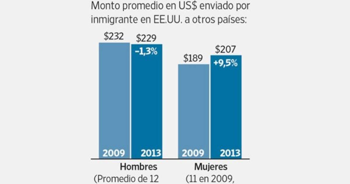 Los hombres enviaron dinero en 12 ocasiones, a US$229 por remesa. Aunque los varones enviaron remesas casi por la misma cantidad y con la misma frecuencia en 2013 que en 2009, durante la recesión, las mujeres elevaron