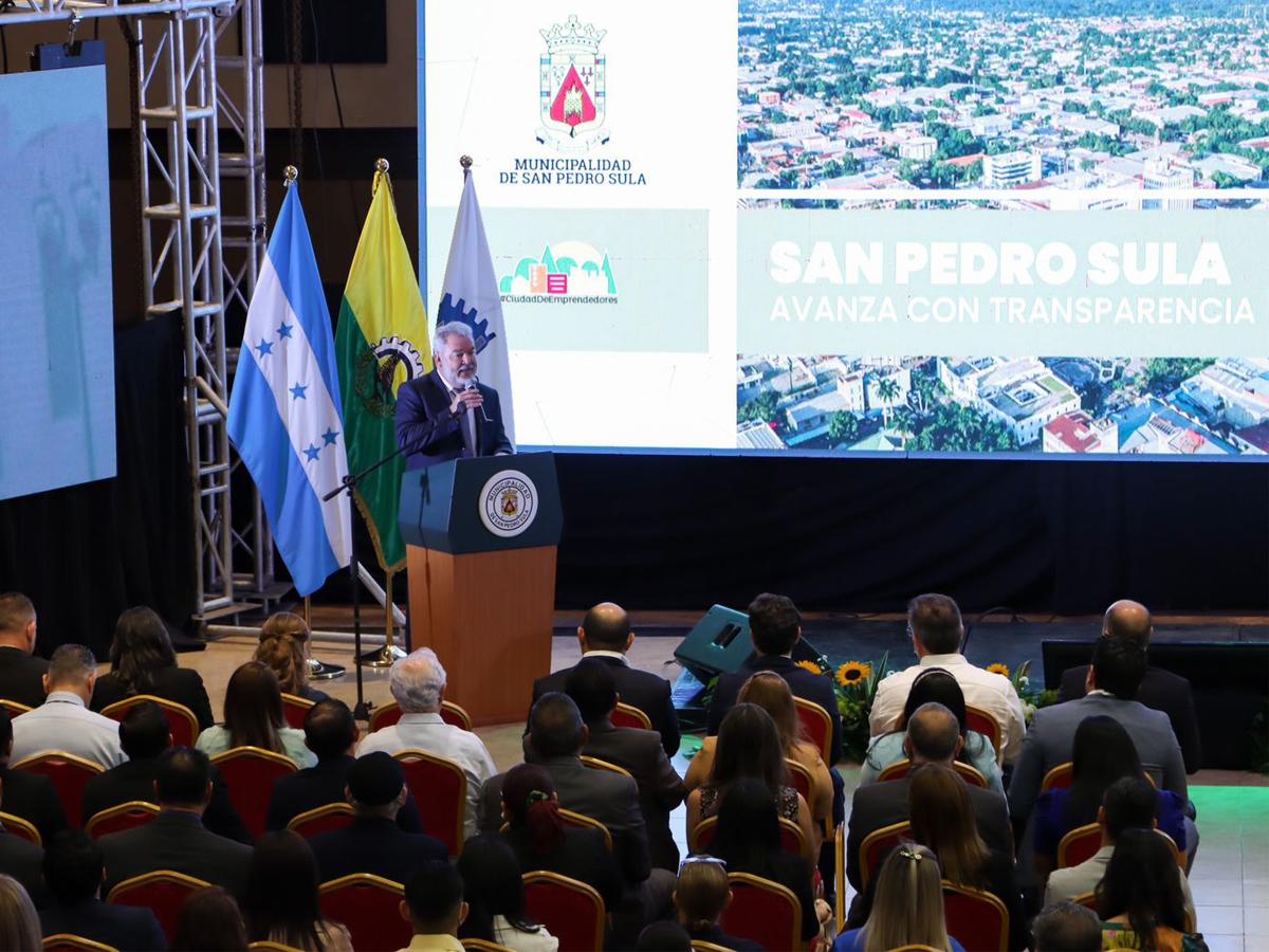El alcalde de San Pedro Sula, Roberto Contreras, presentó junto a su equipo de la Corporación Municipal, el informe de su primer año de gobierno, durante la conferencia “Honduras avanza con Transparencia”, en el salón Mario Belot de Expocentro.
