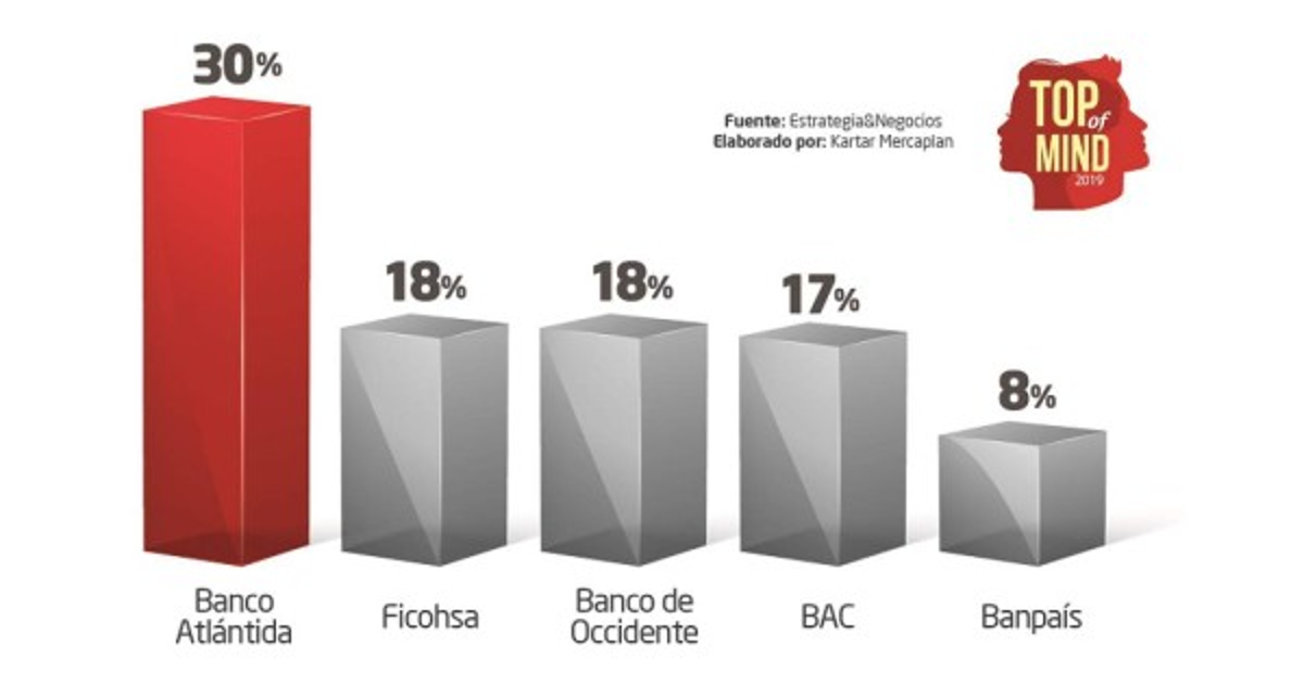 Liderando una vez más el primer lugar del Top of Mind de Honduras, Banco Atlántida sobresale como referente principal en la categoría de instituciones bancarias obteniendo 30% de las menciones de los consumidores hondureños, sobrepasando por más de 10 puntos a sus competidores más cercanos.
