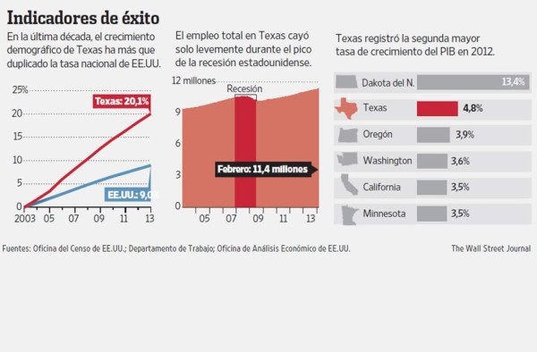 El enorme crecimiento de Texas es un motivo de orgullo para el gobernador republicano Rick Perry, quien se ha referido al “Milagro de Texas” como prueba de que los bajos impuestos y una regulación laxa generan empleo. Los texanos pagaron 7,5% de sus ingresos en impuestos estatales y locales en 2011, frente a 11,4% en California y 9,2% en Florida, según la Tax Foundation, una organización de estudio de impuestos.