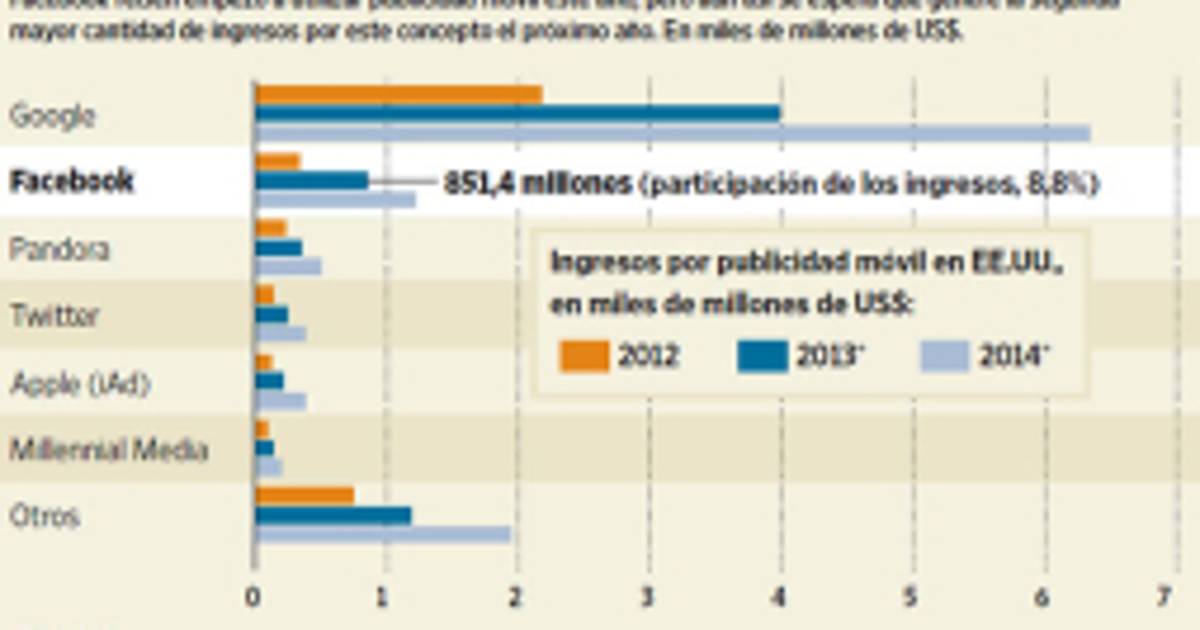 Las ventas totales de anuncios de la compañía han crecido menos de 10% cada trimestre de este año, y Facebook sigue siendo un actor pequeño en la industria publicitaria general, a la sombra de otros gigantes de Internet, como Google Inc.La capitalización de mercado de Facebook bordea los US$73.000 millones, incluyendo opciones sobre acciones y títulos restringidos, tras cerrar el lunes en US$26,75.Se espera que la batalla que le espera sea larga. General Motors Co. retiró su presupuesto publicitario para Facebook la víspera de su salida a bolsa, tras decidir que los avisos pagos en el sitio tenían poco impacto en las compras de autos. La automotriz no ha vuelto a comprar anuncios en la red social.