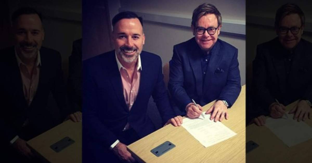 En esta foto, Elton John tiene un lapicero en la mano, frente a un documento. Se puede ver que luce un anillo en la mano izquierda.