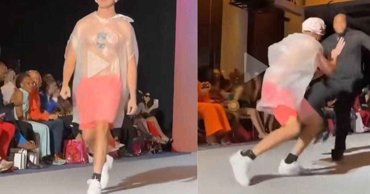 En el tiktok se ve como el influencer logra terminar la pasarela y un guardia de seguridad se avienta sobre él para poder bajarlo de la pasarela.