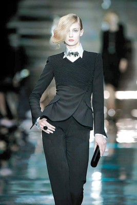 Giorgio Armani presentó una colección exquisita basada en los efectos ópticos que producen la superposición de múltiples capas de seda y tul. Esta nueva colección, que presenta en tonos neutros y pastel, recoge cortes de la sastrería masculina que el diseñador italiano reinterpreta para feminizarlos.