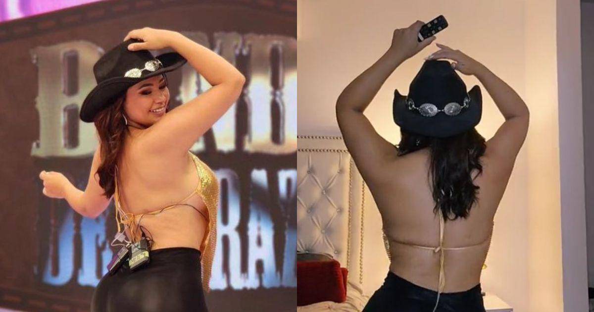 La comunicadora social luce un hermoso traje de vaquera que incluye un sombrero color negro, una blusa dorada, un pantalón y botas negras.