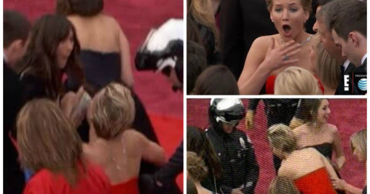 La actriz ganadora del Oscar el año pasado y nominada nuevamente por su papel en America Hustle, Jennifer Lawrence cayó esta vez a su llegada a la alfombra roja de los premios Oscar 2014.