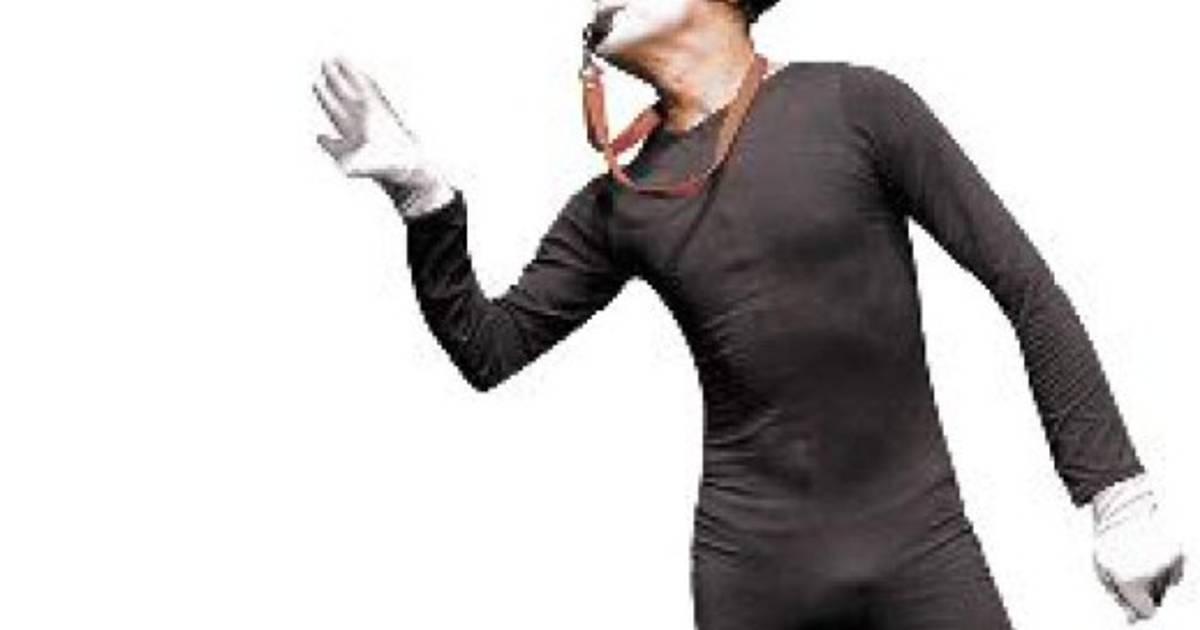 El escenario se viste con un fondo oscuro, entonces aparece el mimo con su rostro pintado de blanco y ataviado de oscura vestimenta.