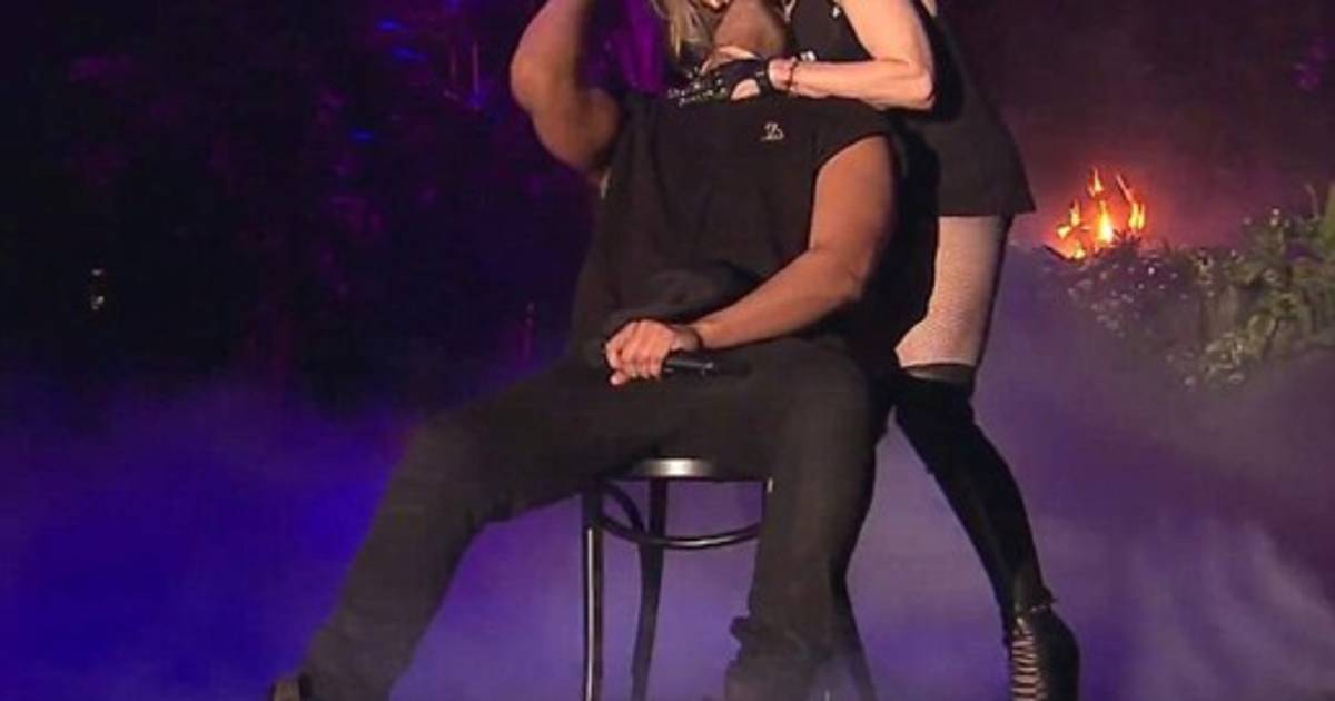 La artista de 56 años, vestida con una camiseta larga negra en la que se podía leer 'Big As Madonna', no pareció darse cuenta de la reacción de del rapero, que tras recibir el 'morreo' de la cantante se tapó la boca con expresión de dolor.