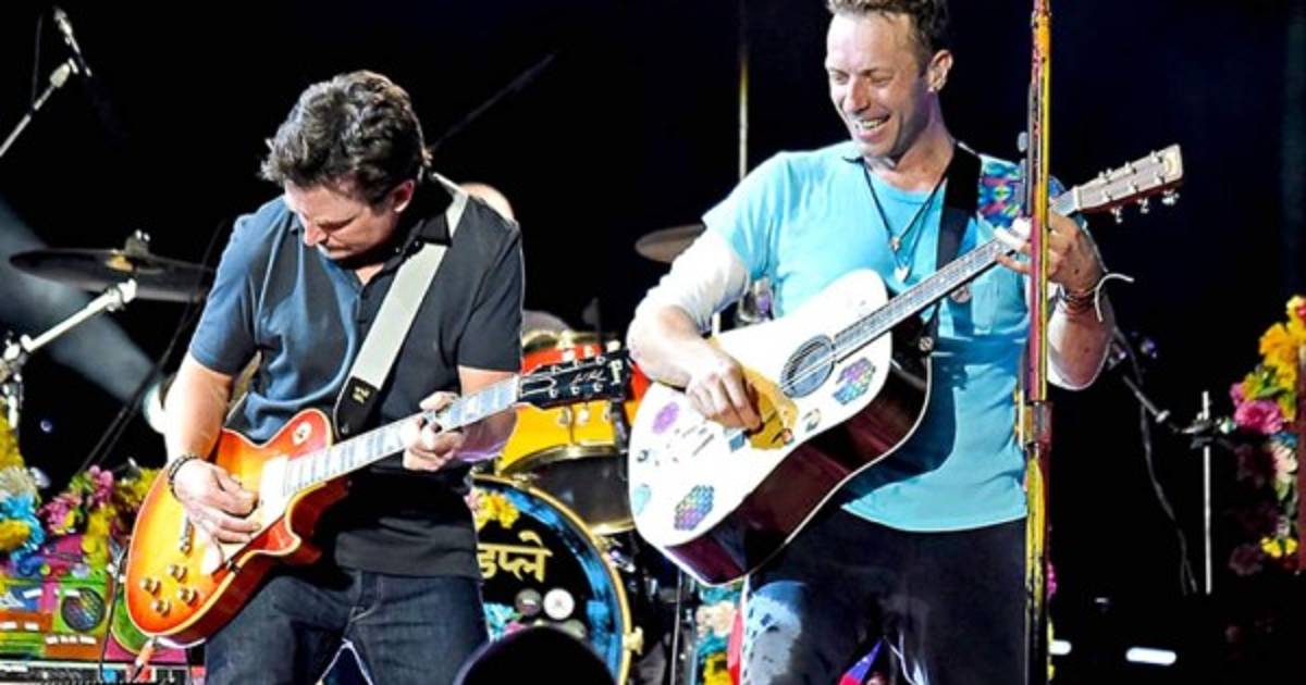 El actor Michael J. Fox hizo un homenaje a Volver al Futuro al tomar la guitarra en uno de los espectáculos que brindó la banda de Chris Martin en Nueva Jersey este sábado.