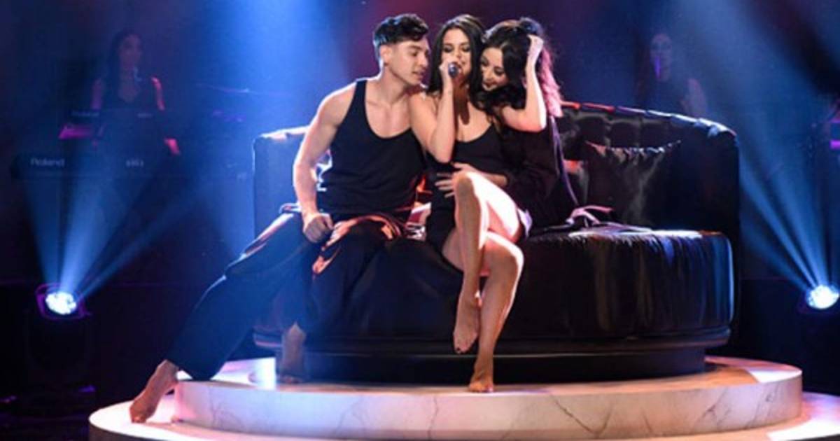 Sin embargo, el 'show' no acabó ahí, pues seguido del hombre apareció una mujer, quien no sólo interactuó con él, también con Selena, quien en un momento parecía estar involucrada en un trío muy 'hot' mientras seguía cantando.