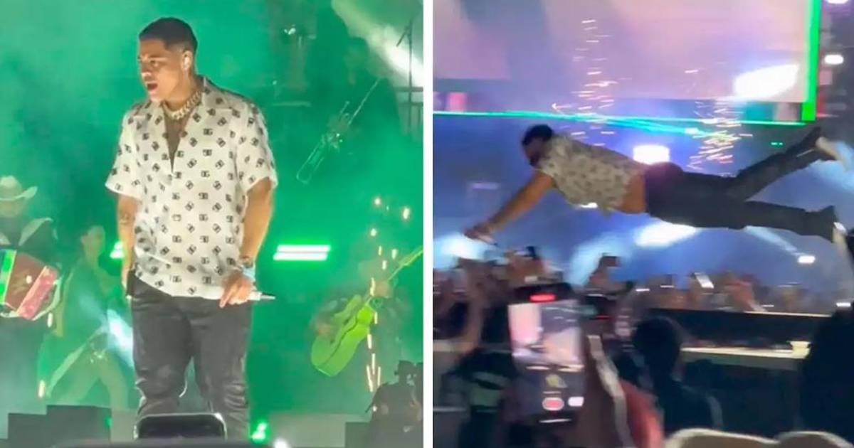 El intérprete de “Tu Perra Vida” se lanzó y en lugar de que los fans lo cacharan, se hicieron a un lado, por lo que el cantante cayó al suelo, tardó un minuto en levantarse, pues internautas aseguran que fue un golpe muy fuerte.