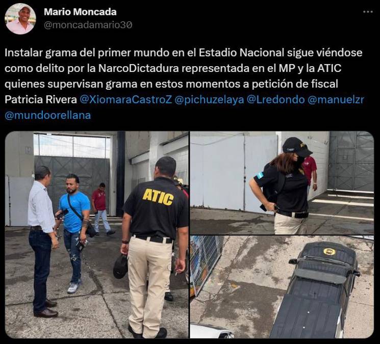 13 / 16Tras enterarse de la intervención de la ATIC en el estadio Nacional, Mario Moncada, Comisionado Nacional de Deportes (CONDEPOR), se pronunció en sus redes sociales: “Instalar grama del primer mundo en el Estadio Nacional sigue viéndose como delito por la Narco-Dictadura representada en el MP y la ATIC, quienes supervisan grama en estos momentos a petición de fiscal Patricia Rivera”, expresó .