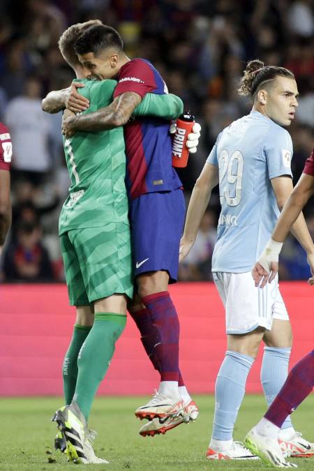 36 / 38Ter Stegen le dio este fuerte abrazo a Joao Cancelo, autor del gol de la victoria del Barcelona.