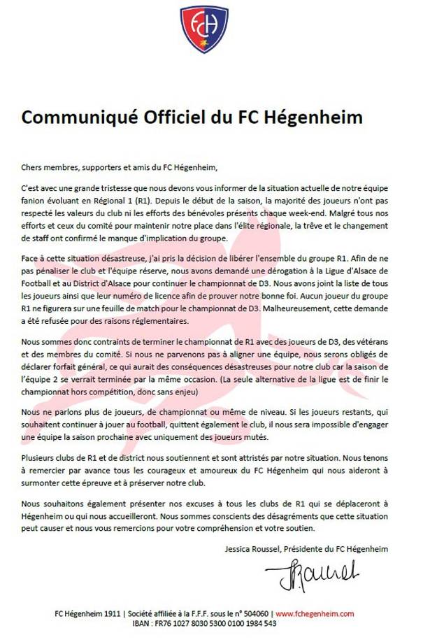 5 / 18“Una página se cierra”, expresó la dirección del Hégenheim FC en su publicación en Facebook, donde también se señaló que el equipo había mostrado una falta de compromiso y profesionalismo que no era compatible con la imagen que el club deseaba proyectar.