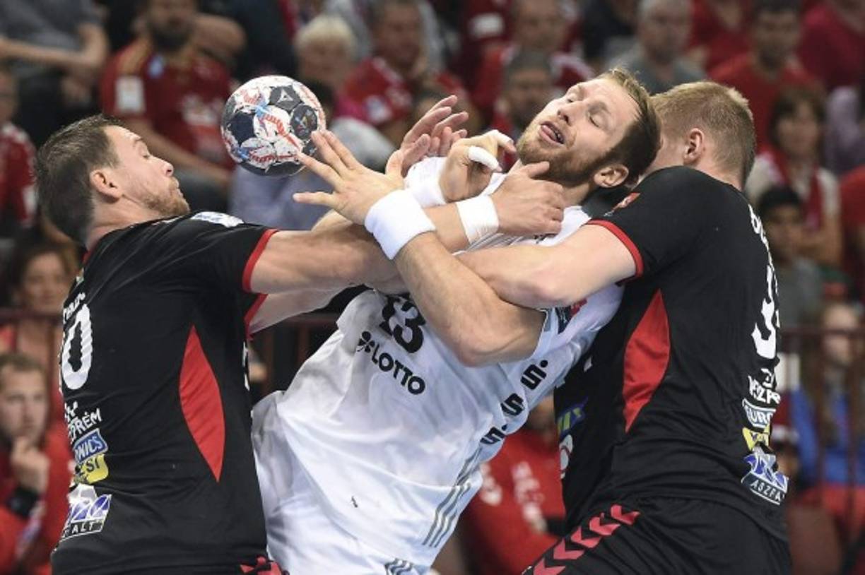 6 / 6BALONMANO. Marcaje furioso. Mirsad Terzic y Blaz Blagotinsek, del equipo Telekom Veszprem, enfrentan con todo a Steffen Weinhold, del Kiel, en el partido de la cuarta ronda del grupo B de la Liga de Campeones que se celebra en Budapest, Hungría.
