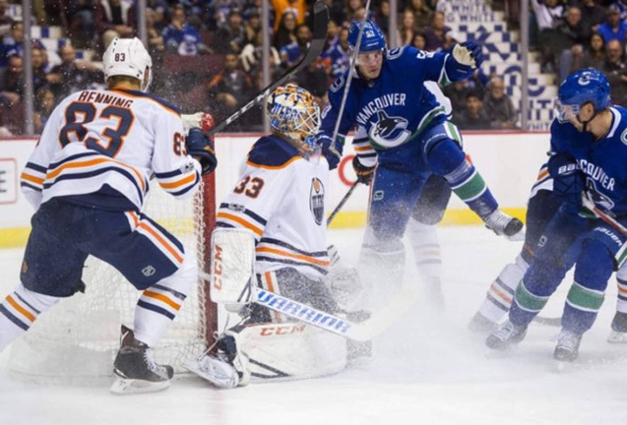 4 / 6HOCKEY SOBRE HIELO. Lucha en Canadá. Bo Horvat, de los Canucks de Vancouver, celebra después de anotar un gol al portero Cam Talbot, de los Oilers de Edmonton, en la NHL. -