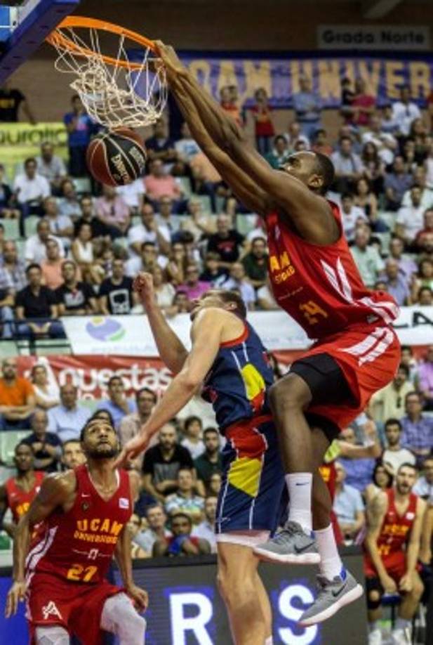 5 / 6BALONCESTO. Clavada belga. Kevin Tumba, pívot belga del Ucam Murcia, hace un mate ante el alero esloveno de Andorra Morabanc, Jaka Blazic, por la Liga Endesa, en España. -
