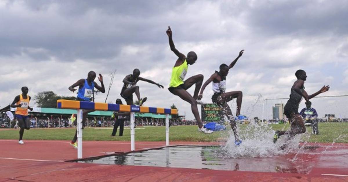 1 / 6CARRERA CON OBSTÁCULOS. Velocidad y agilidad. Atletas kenianos en plena acción durante la carrera de los 3,000 metros con obstáculos en los ensayos para los Juegos Olímpicos de Río de Janeiro 2016, en la ciudad de Eldoret, Kenia. -