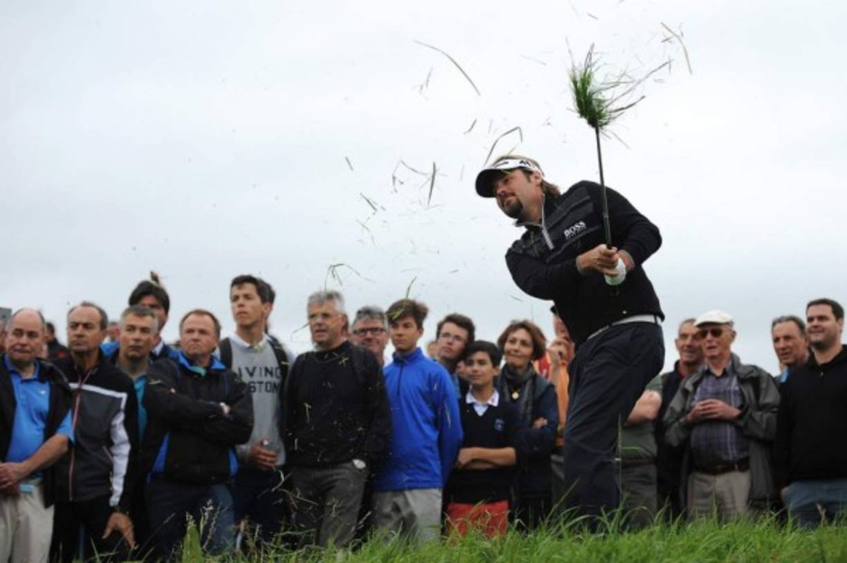 4 / 6GOLF. Un tiro con todo y pasto. El francés Víctor Dubuisson realiza su segundo tiro desde el rough en el hoyo 13 durante la primera ronda de los 100 en el Abierto de Francia en Le Golf National, que se disputa en París, Francia. -