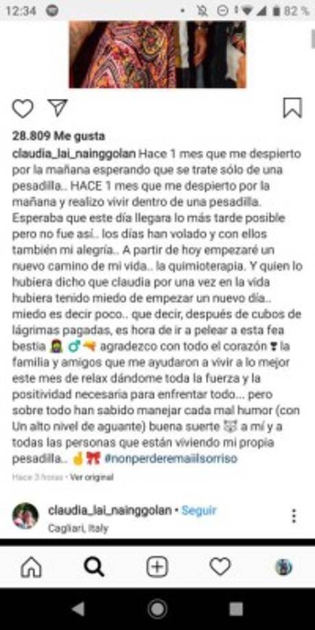 7 / 15'Los días han pasado volando y mi alegría, también. A partir de hoy comienzo un nuevo camino en mi vida: la quimioterapia', comenzó expresando la joven italiana. -