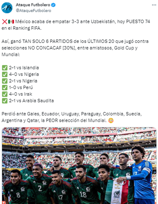 10 / 20Ataque futbolero: “México acaba de empatar 3-3 ante Uzbekistán, hoy PUESTO 74 en el Ranking FIFA”.