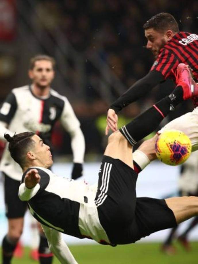 16 / 28Cristiano Ronaldo le pegó de esta manera acrobática y el balón dio en la mano del defensa italiano Davide Calabria. Foto AFP -