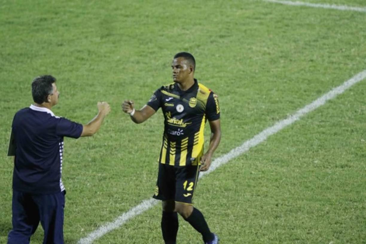 17 / 26Mauro Reyes, entrenador del Honduras Progreso, saludando a Rony Martínez al final del primer tiempo. -