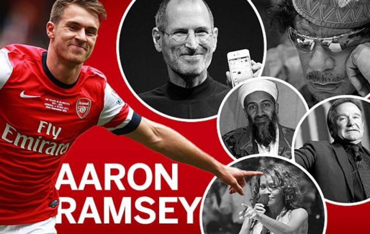 10 / 26Osama Bin Laden, Stebe Jobs,Muammar Gaddafi, Whitney Houston, son algunos de los famosos que han muerto al siguiente día que el jugador Aaron Ramsey marca. -