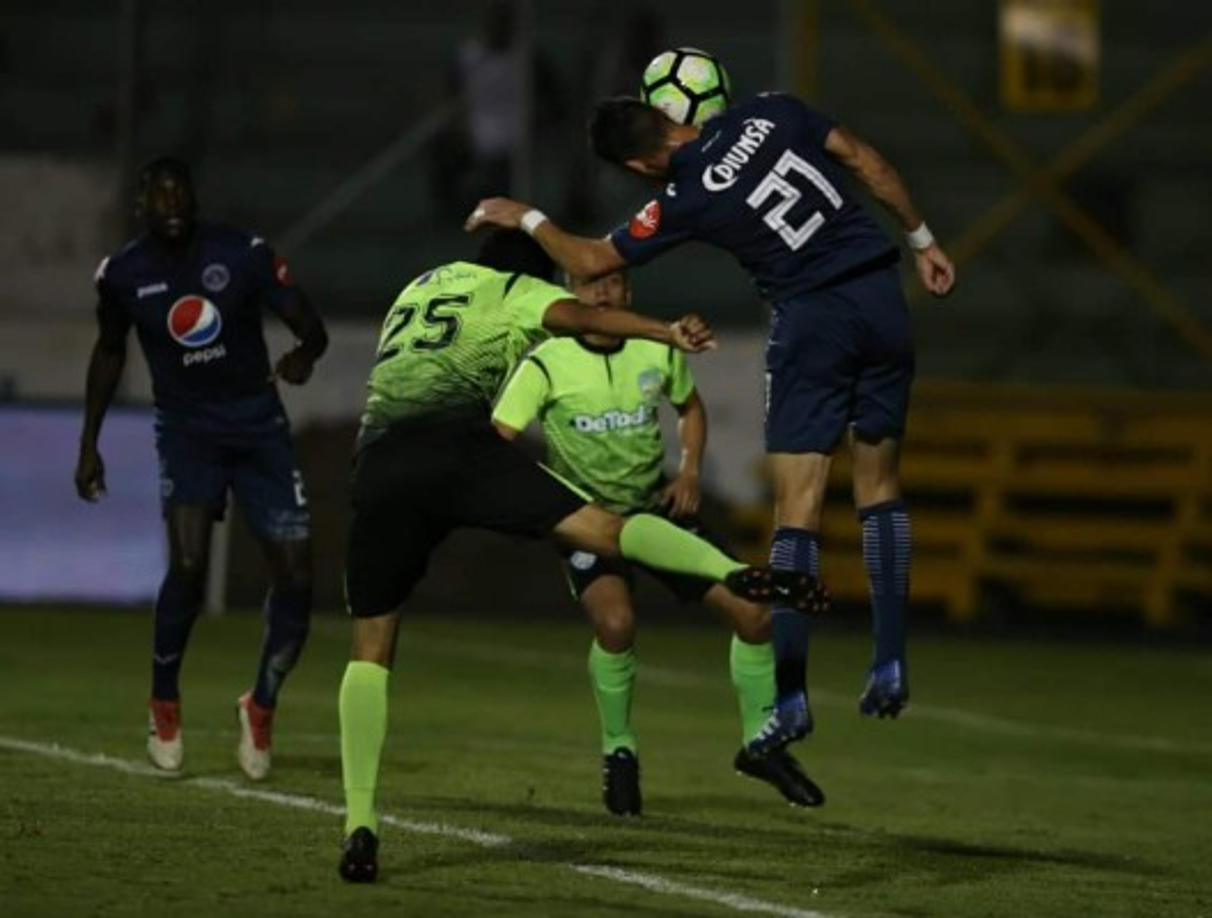 4 / 29Momento en el que el paraguayo del Motagua, Roberto Moreira, cabecea para su primer gol contra el Real de Minas. -