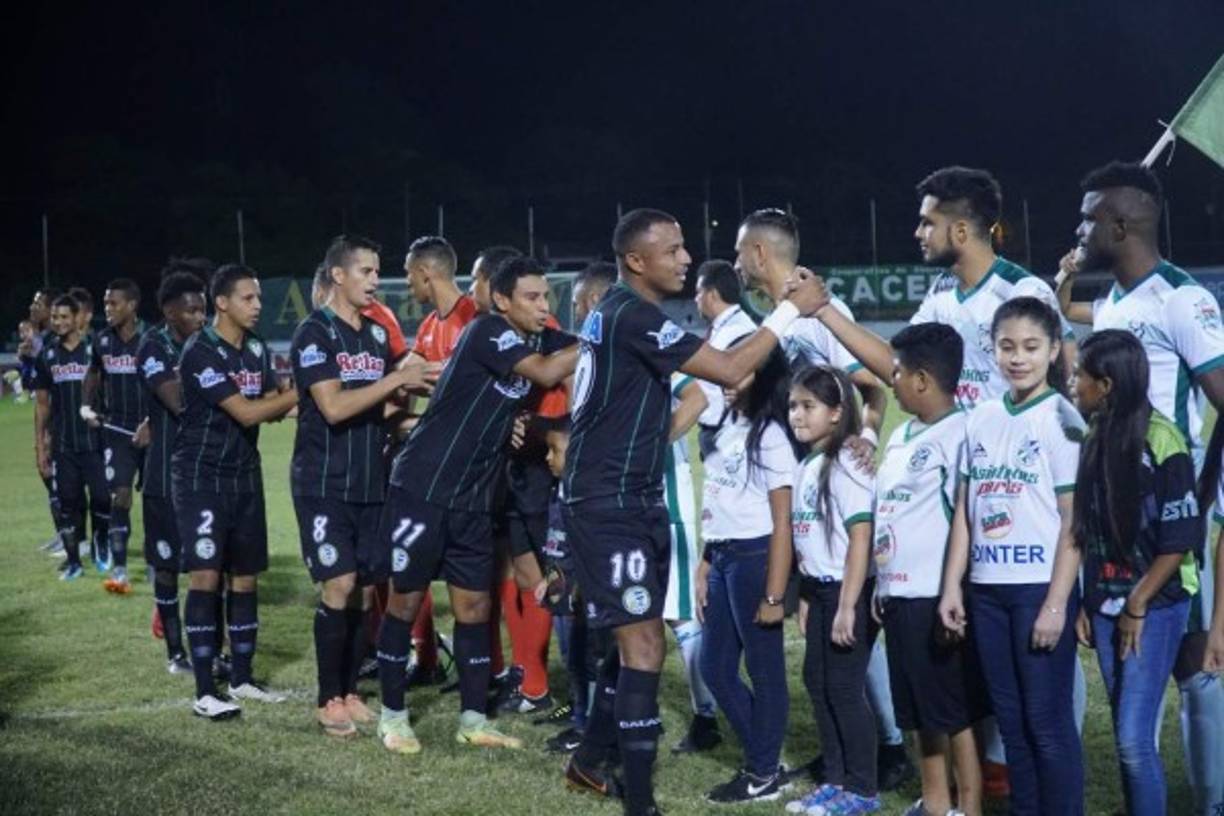 6 / 29Los jugadores de Platense y Juticalpa se saludan antes del inicio del partido en el estadio Excélsior. -