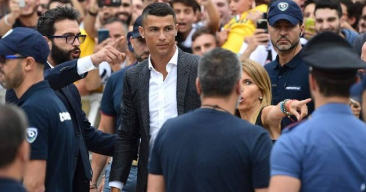 2 / 20Al llegar a la sede de la 'Juve' el lunes para someterse al reconocimiento médico, Cristiano, rodeado por miembros de seguridad, fue recibido por centenares de 'tifosi' . -