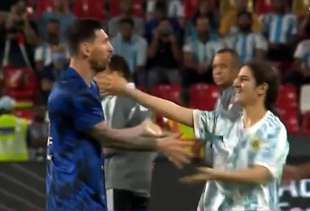 14 / 18Durante el partido, una aficionada con la camiseta de argentina se metió al campo para abrazar a Messi.