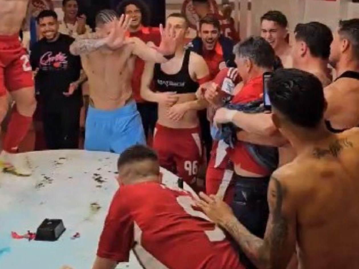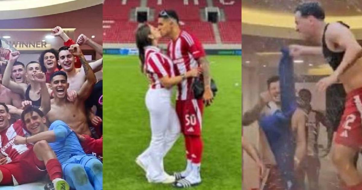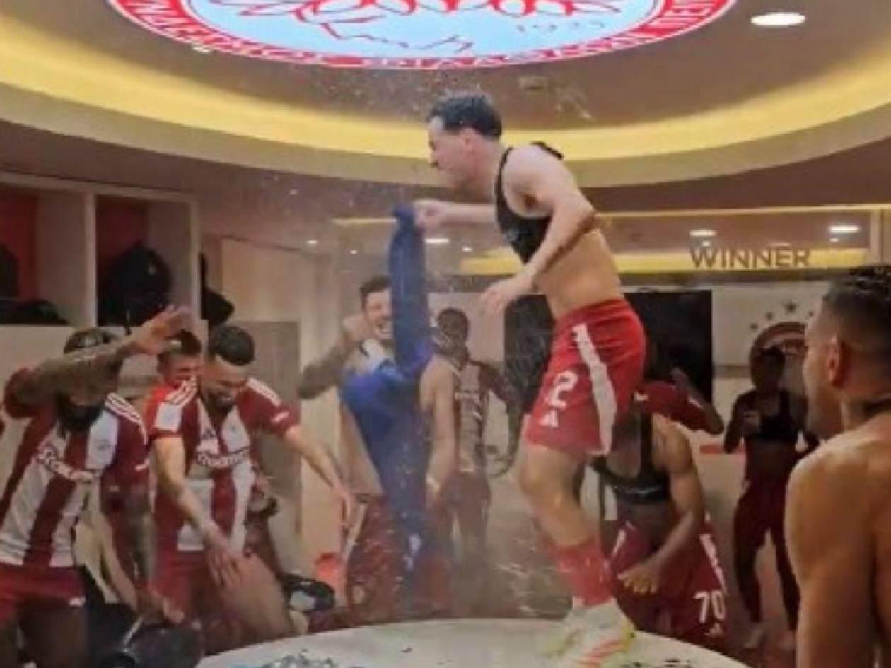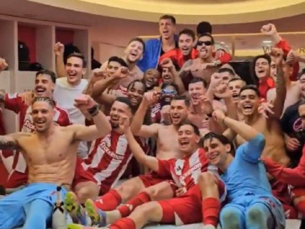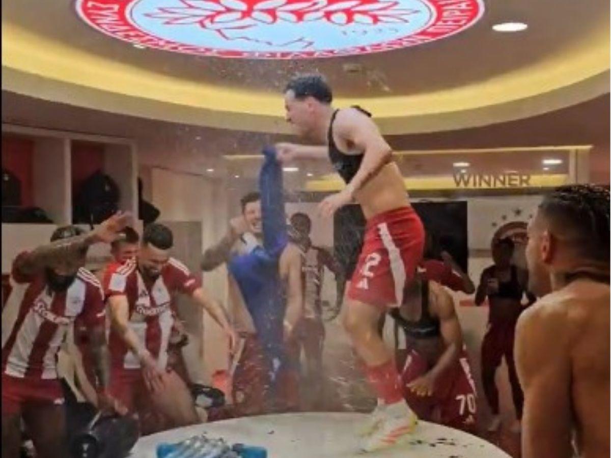 Las celebraciones continuaron en los camerinos. El Olympiacos desató la locura.