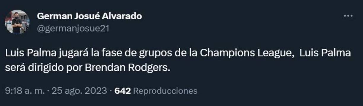 11 / 15German Alvarado, comunicador deportivo de Diario La Prensa: “Luis Palma jugará la fase de grupos de la Champions League. Luis Palma será dirigido por Brendan Rodgers”.