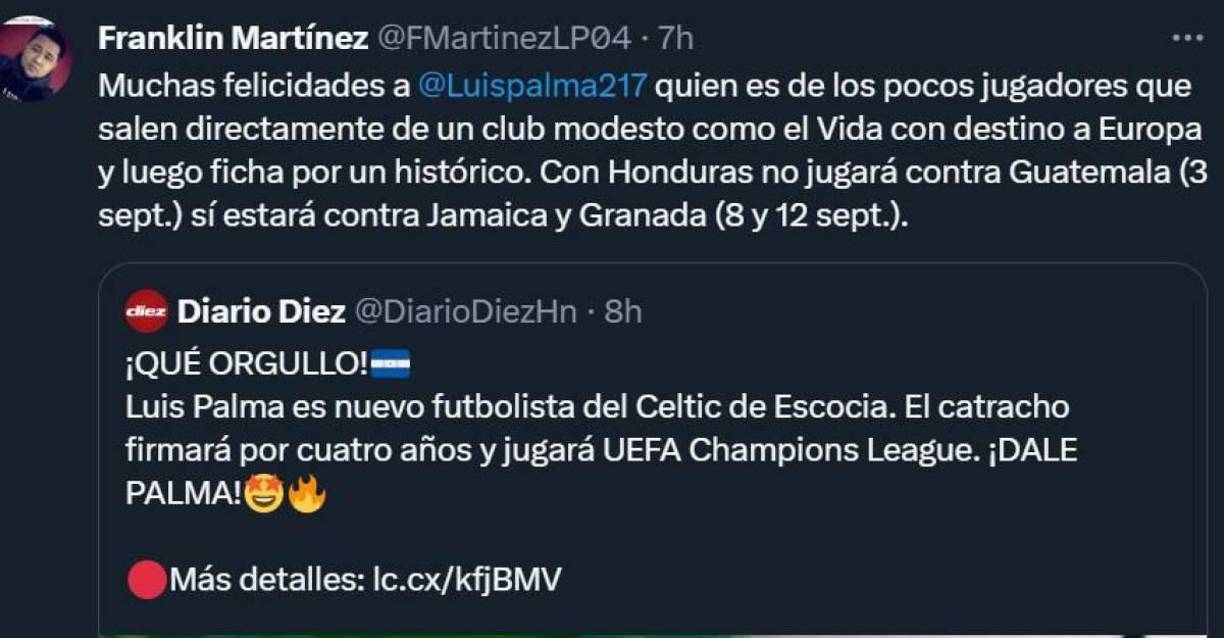 2 / 15Franklin Martínez, comunicador de Golazo de Diario La Prensa: “Muchas felicidades a Luis Palma, quien es de los pocos jugadores que salen directamente de un club modesto como el Vida con destino a Europa”.