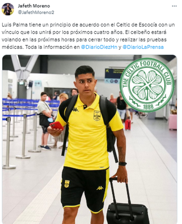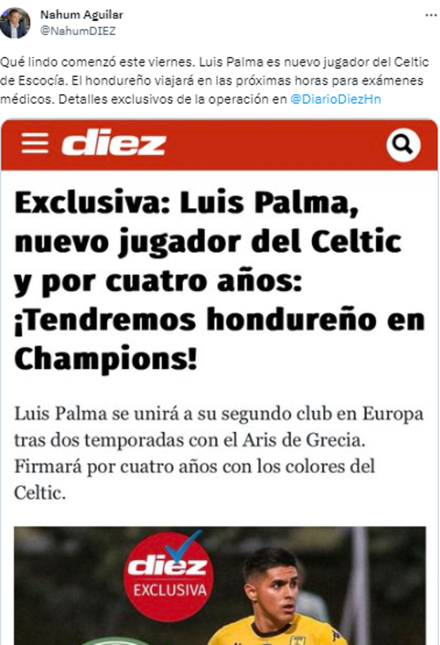 5 / 15Nahún Aguilar, director de DIEZ: “Luis Palma es nuevo jugador del Celtic de Escocia. El hondureño viajará en las próximas horas para exámenes médicos”.