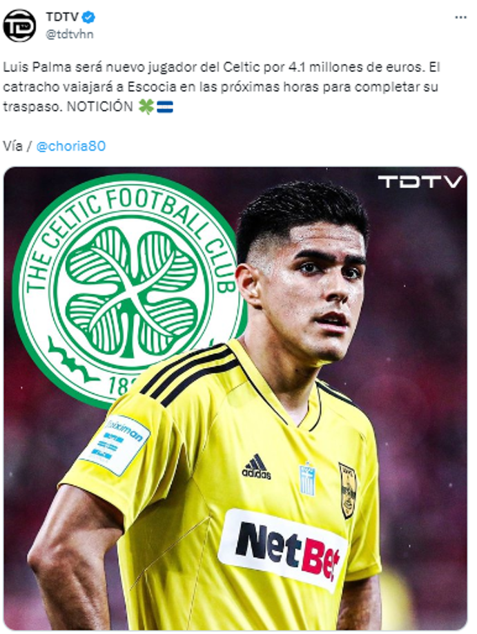 3 / 15TDTV: “Luis Palma será nuevo jugador del Celtic por 4.1 millones de euros. El catracho viajará a Escocia en las próximas horas para completar su traspaso. NOTICIÓN”.