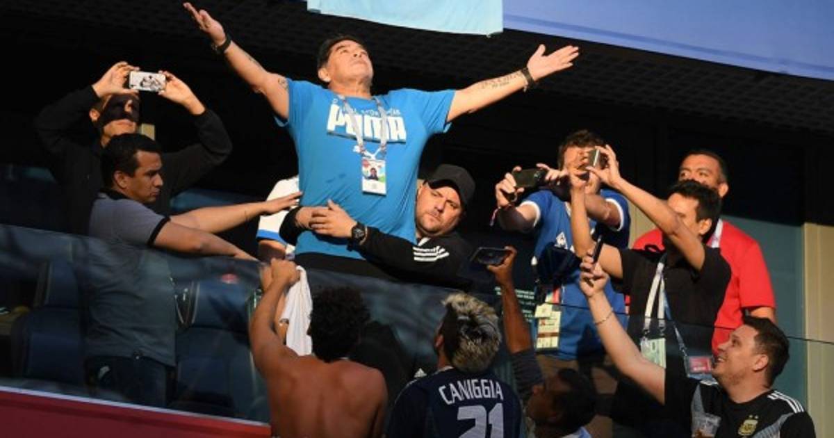 6 / 15Retired Argentina player Diego Maradona (C) gestures during the Russia 2018 World Cup Group D football match between Nigeria and Argentina at the Saint Petersburg Stadium in Saint Petersburg on June 26, 2018.