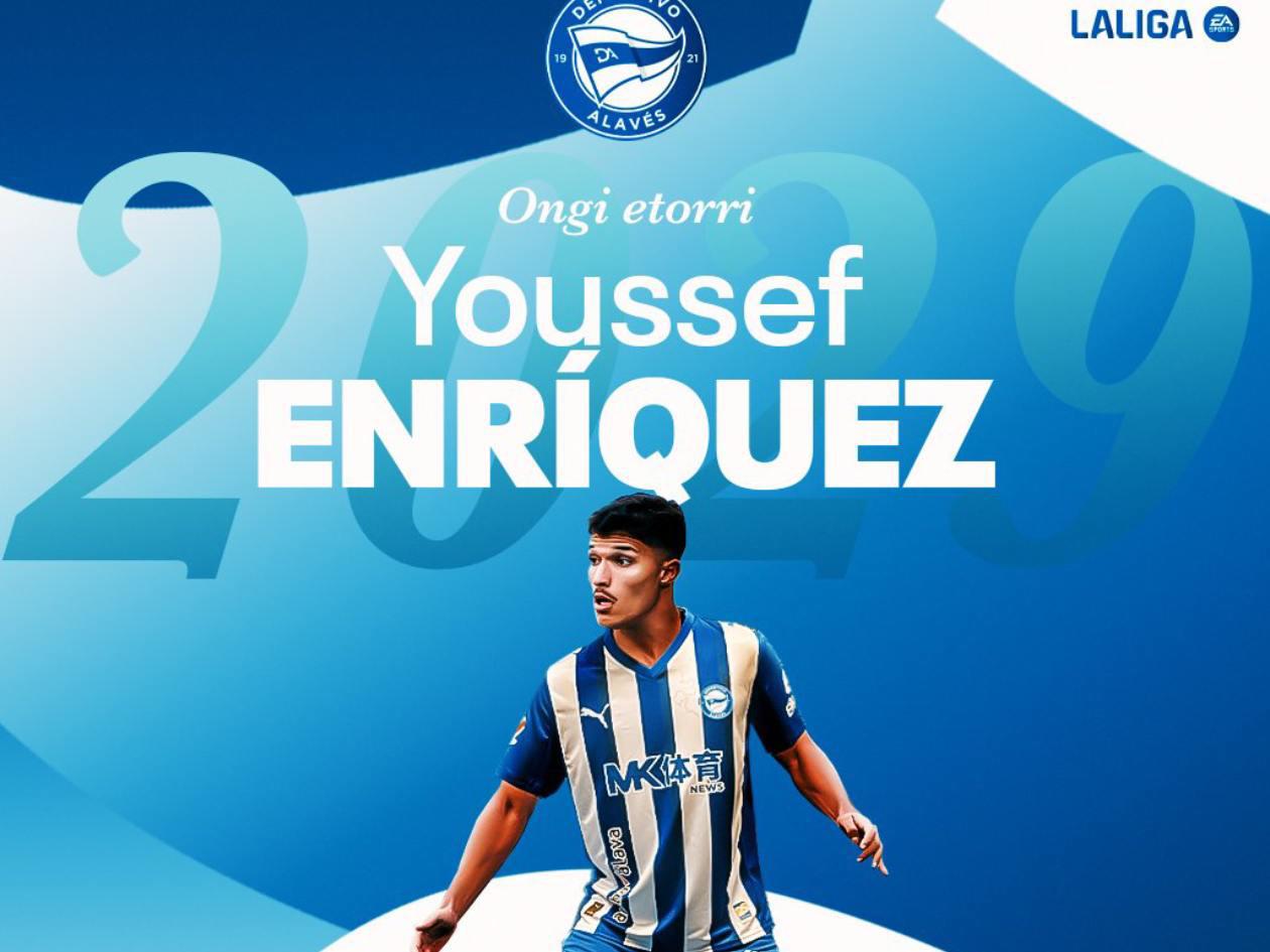 OFICIAL: El Deportivo Alavés ha hecho oficial la incorporación de Youssef Enríquez, también conocido como 'Yusi', en una operación que aleja al lateral marroquí del Real Madrid, club en el que llevaba 8 años. Se lo compraron al cuadro merengue por 3.000.000 € + 50% futura venta. Firma hasta junio de 2029.